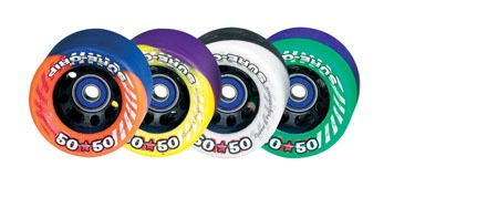 The catalog page features Speed Jam Wheels from Sure-Grip, Vanilla, Labeda, Atom, and Omega. These wheels are primarily designed for indoor rink use, with a hardness (durometer) of 95A or higher. They are available in various colors, sizes, and widths. Certain wheels include extra speed grooves, and the hubs are made from a range of materials. Some of the higher-end models even feature removable hubs.…